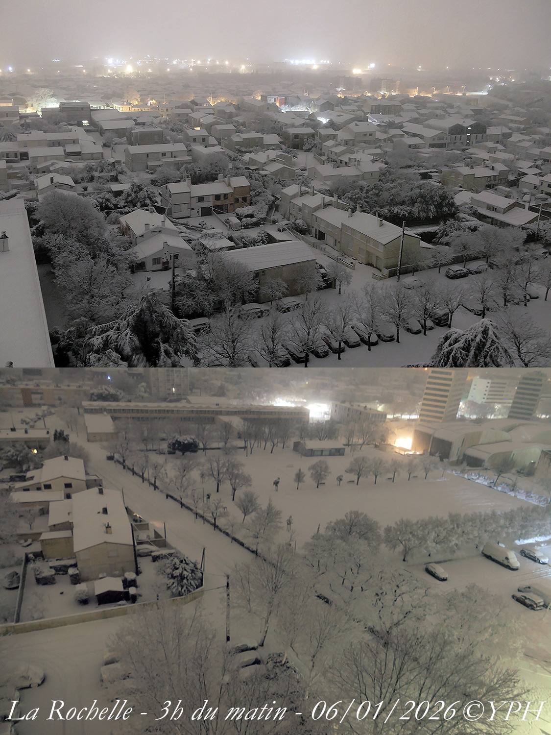 grosse chute de neige sur sol gelé. Lumières des usines à l’horizon.
