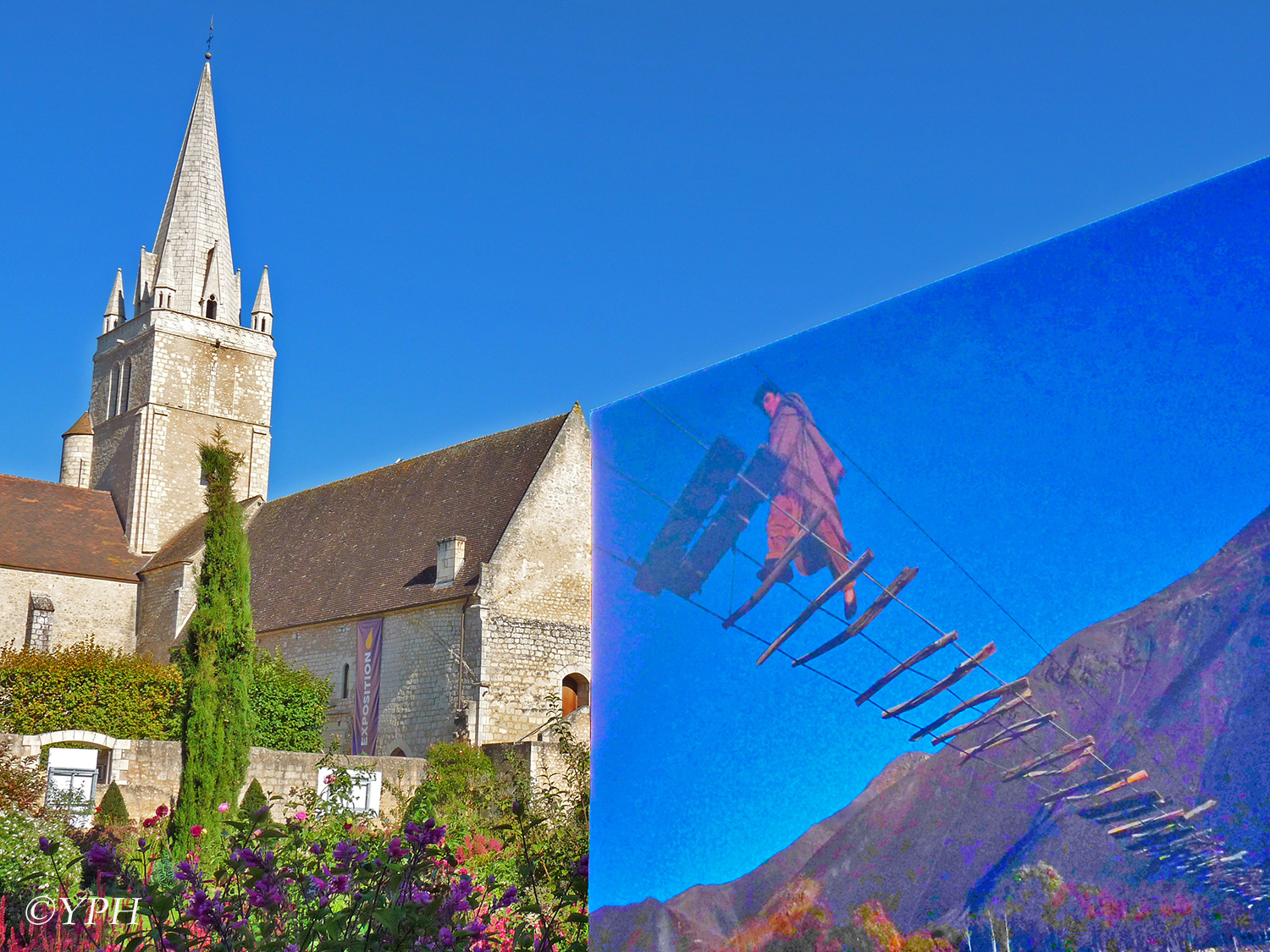 dans le magnifique “Jardin des Images” de Saint Benoît près de Poitiers. Pont improvisé en Afghanistan. Au pied de l’ancienne abbaye, explosion florale.
